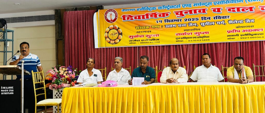 आगरा।नरेश कुमार दिनांक 14 सितंबर 2025 को आगरा के वाटरवर्क चौराहे के समीप होटल अतिथिवन मै इलैक्ट्रिक कॉन्टेक्टर्स एंड मर्चेंट एसोसिएशन की कार्यकारणी के द्विवार्षिक चुनाव वाटर वर्क्स स्थित अग्रवन पर आयोजित किए गए। कार्यक्रम की शुरुआत मुख्य अतिथि भाजपा नेता प्रमोद गुप्ता ने दीप प्रवज्जलित कर की।